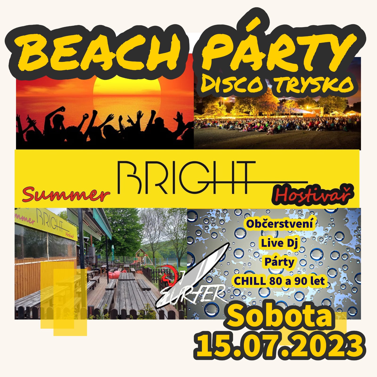 Červenec, 2023 SummerBright Hostivař uvádí: Beach party Disco Trysko 150720:0022:00SummerBright Hostivař uvádí: Beach party Disco Trysko Detaily akceSobotní večer na horním stánku SummerBright se ponese v rytmu diska! Občerstvení, zábava, DJ,.. Těšíme se na vás. Detaily akce Sobotní večer na horním stánku SummerBright se ponese v rytmu diska! Občerstvení, zábava, DJ,.. Těšíme se na vás. Čas(Sobota) 20:00 - 22:00 CalendarGoogleCal Comments are closed.